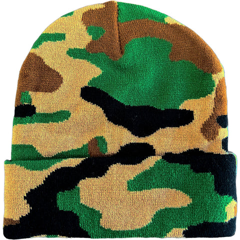 This is our Brown Camo Logo Mens Knit Beanie Hat. This knitted winter hat is a cold weather essential and features our classic square logo woven label on front. The classic army camouflage pattern has brown, light brown, green and black.