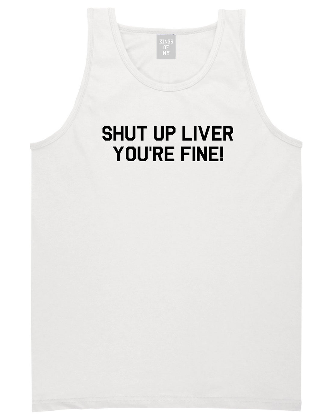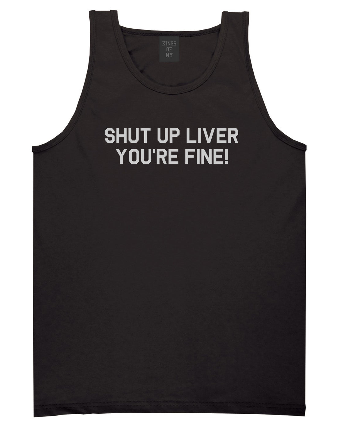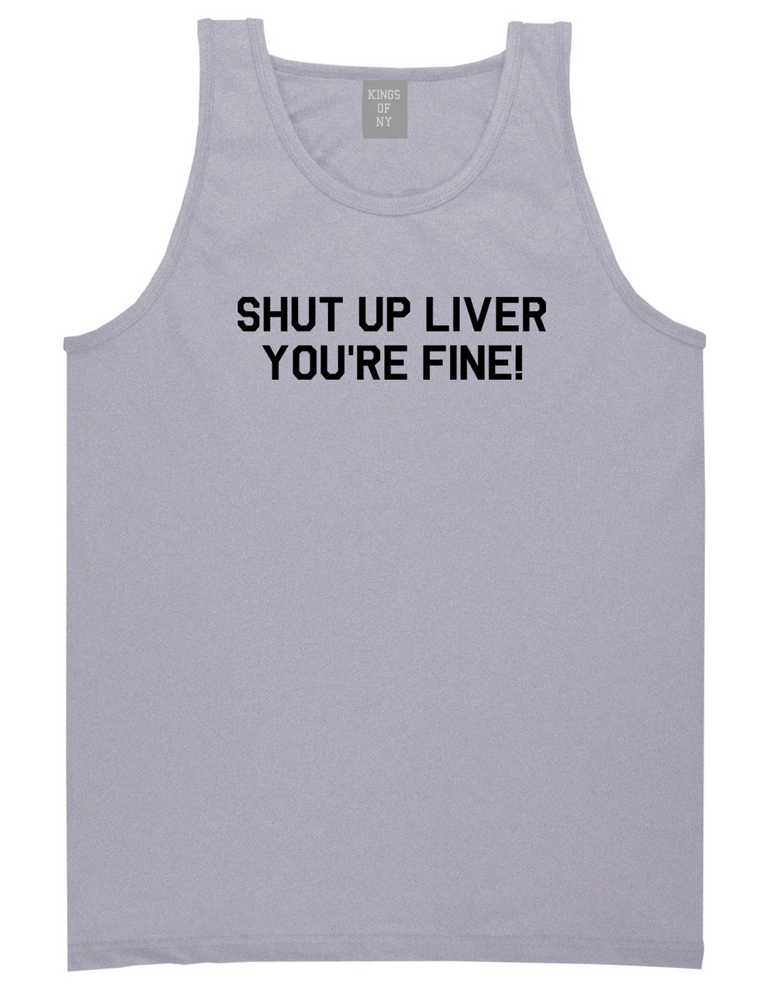 Shut Up Liver Youre Fine Mens Tank Top Shirt by Kings Of NY. This Tank Top Shirt is made of 100% cotton. Grey is 90% cotton and 10% poly. All our graphic shirts are professionally printed in house and all orders will ship on the next business day after purchase.
