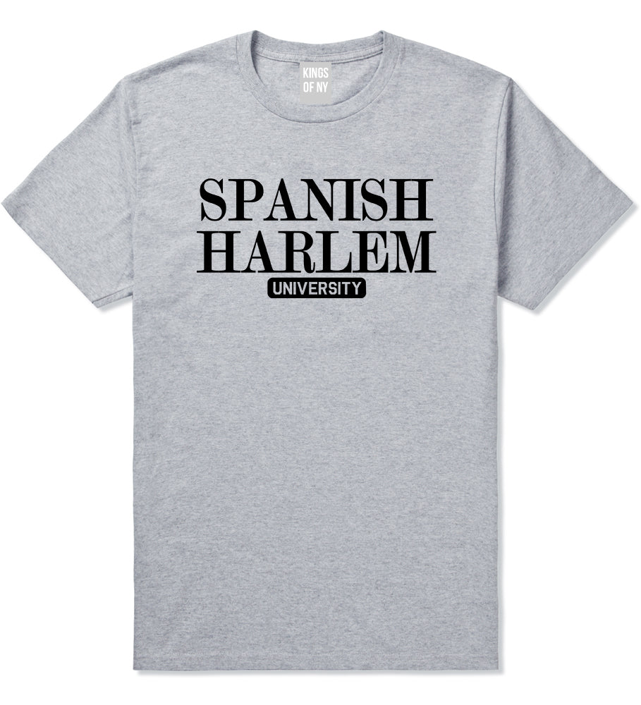 Shop Spanish Harlem University New York Mens T-Shirt by Kings Of NY. This graphic tee features Spanish Harlem aka “El Barrio,” is a area of NYC with a lot of Puerto Rican culture amongst others. Its located in the upper manhattan area north of the Upper East Side and East 96th Street up to around East 142nd Street east of Fifth Avenue to the East and Harlem Rivers.