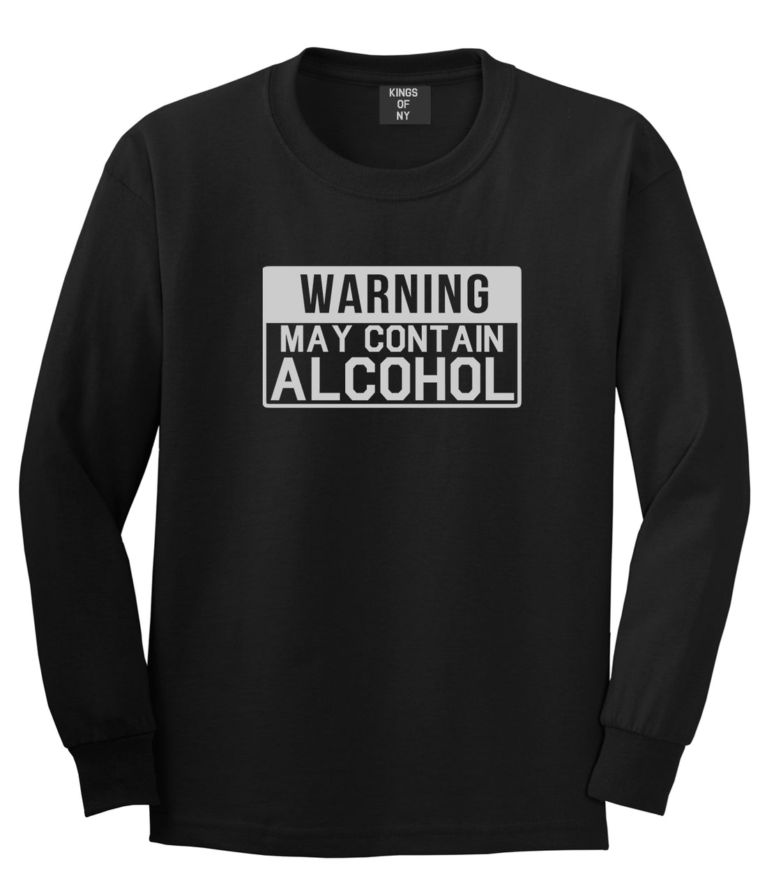 Warning May Contain Alcohol Mens Long Sleeve T-Shirt by Kings Of NY. This tee is made from 100% cotton. Grey is 90% cotton and 10% poly.