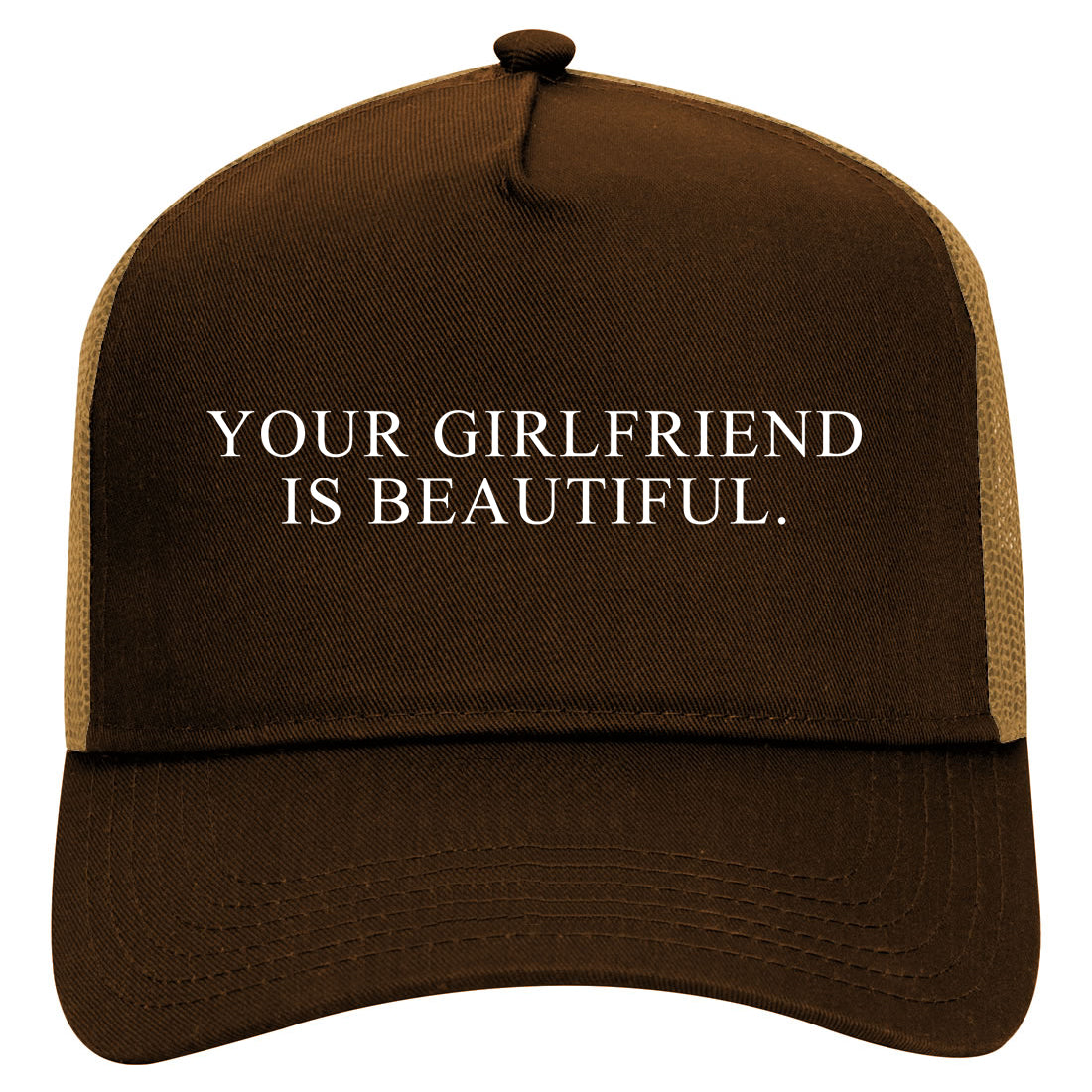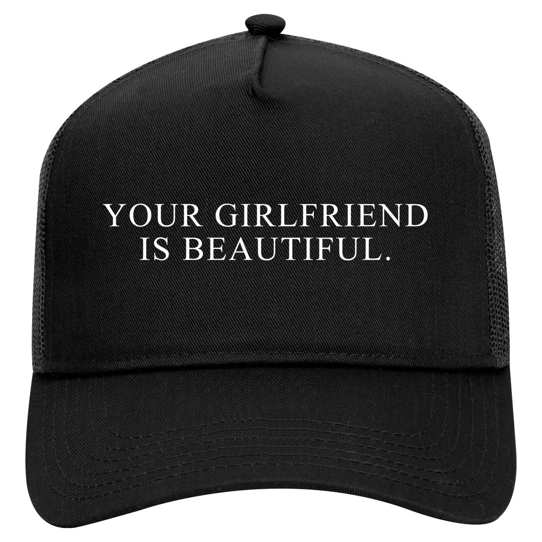 Shop our Your Girlfriend Is Beautiful Retro Adult 5 Panel Mesh Trucker Hat. This classic adult mesh trucker cap features a printed graphic on front with a curved brim for a retro but premium look and fit.